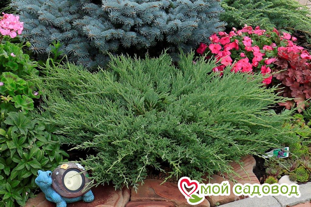 При посадке кустов можжевельника на участке учитывайте их форму и размеры, особенности окраски хвои. Среднерослые сорта хорошо смотрятся у основания альпийской горки. Стелющиеся разновидности высотой до 1 м размещают вдоль дорожек и тротуаров. Высокорослые экземпляры размером до 50 см (к примеру, можжевельник чешуйчатый) располагают в рокариях. Колоновидный можжевельники гармонично выглядит на заднем плане.
