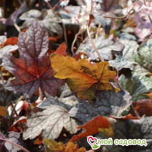 Куст растения плотный, с шарообразной кроной, небольшого размера, компактный, около 30 см высотой и 40 см шириной. Растение хорошо и быстро разрастается. Листва яркая и эффектная, крупного размера, округлой формы, со слабой рассеченностью, глянцевая, с волнистыми краями. Листовые пластинки плотные, темно-красно-коричневые, имеют лимонно-зеленую кайму. Гейхерелла сохраняет цвет листвы на протяжении всего сезона. Черешки длинные, густо опушенные. В период цветения на высоких, прямых и ровных цветоносах (около 40 см высотой) появляются соцветия метельчатой формы с небольшими колокольчатыми белыми цветами. Гейхера – это целый род многолетних травянистых растений семейства камнеломковых. Эти растения в нашем климате уходят на зимовку под снег облиственными и с первыми лучами солнца снова украшают клумбу, создавая прекрасный фон для всех цветов, которые вырастут здесь позже.