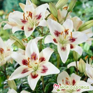 Гладиолус Карин (Carine) Растение с нежными цветами белой окраски и фиолетовой серединой. Высота растения колеблется от 45 до 60 сантиметров. Оптимальная почва: хорошо дренированная, мульчированная. Особенности ухода: хороший полив, но без застоя воды, применение микроудобрений, рыхление почвы, прополка сорняков. Особенности размножения: детками, образующимися вокруг клубнелуковиц. Возможно и семенное размножение для выведения новых сортов. Применение: в ландшафтном дизайне для создания уютных красивых дворов, в садах. Из них собираются невероятно шикарные букеты. Посадка. Из-за погодно-климатических особенностей в разных регионах России сроки посадки отличаются: На Юге (Краснодарский край (Кубань), Северный Кавказ) — сажать можно уже в конце апреля. В Средней полосе (в т. ч. Подмосковье) — оптимальное время приходится на начало или середину мая. В Сибири, на Урале, в Ленинградской области — в середине или конце мая. Места посадки должны быть солнечными, без сквозняков и с качественно дренированной почвой. Затенённые участки плохо сказываются на развитии культуры. Однако в южных районах небольшое затенение допускается. Глубина высадки луковиц обычно составляет 8-10 см (для мелких), 10-15 см (для крупных). Полив. Средняя частота поливов культуры составляет раз в неделю, а летом, в жаркие дни, один раз в 3-4 суток. Поливают утром или вечером, используя около 10-12 л воды на 1 м2. Полив производят в специально подготовленные междурядные борозды, углублённые до 30-50 мм с тем, чтобы капли воды не попадали на листики гладиолусов. Без регулярного полива цветы быстро завянут. По завершении процедуры кусты окучивают. Раз в декаду обязательно производят рыхление почвы.