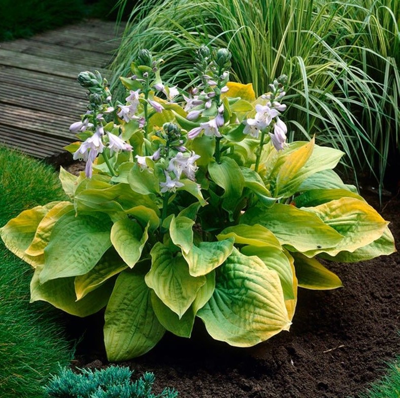 Это абсолютно неприхотливый травянистый многолетник. Выращивают его практически в каждом саду. Цветок отлично сочетается с другими «обитателями» участка и не требует сложного ухода. Купить недорого качественный посадочный материал можно в нашем интернет-магазине. Как выглядит растение? Куст вырастает плотным и немного ассиметричным. В высоту он достигает 50 см, а в ширину – 1,05 м. Листья чашевидные, морщинистые, округло-сердцевидной формы. Размер листовой пластинки составляет 23 х 20 см. Сверху листья матовые, с сильным жилкованием, а по краям – волнистые. Весной они зеленовато-желтые, летом – золотисто-желтые. Цвести растение начинает на 3 недель позже остальных желтолистных хост. Цветки имеют колокольчатую форму и бледно-лиловый окрас. Применение в ландшафтном дизайне Аугуст Мун достойно дополнит любую ландшафтную композицию. Многим нравится выращивать его в рабатках, на альпийских горках, вдоль бордюров и садовых тропинок. Гиацинт хорошо выглядит в компании с цветущими лиственными растениями и вечнозелеными хвойниками. Не менее эффектно он смотрится на фоне лилейников, пионов, папоротников и разных сортов астильб. Многолетник можно использовать как почвопокровник, размещая его вдоль берегов искусственного водоема и в тенистых местах. Советы по посадке и выращиванию Хоста любит питательный грунт, насыщенный влагой. При этом застой воды противопоказан саженцам. Во время посадки корневище многолетника аккуратно расправляют по земляной насыпи, сделанной заранее в лунке. Сверху насыпают плодородную почвосмесь, слегка утрамбовывают ее и щедро поливают. Корневую шейку укрывают торфом или сухим перегноем. Уход за декоративной культурой не сложный. Необходимо вовремя проводить прополку, внесение подкормок и рыхления. Орошения осуществляют с интервалом в 3 – 4 дня. Размножают хосту семенами или делением куста. Положительные качества хосты Аугуст Мун Садоводы любят этот сорт за такие качества: длительное цветение и тонкий аромат; крепкий иммунитет; отменный декоративный вид; доступная цена; универсальное применение. Купить недорого хосты можно в интернет-магазине «Мой садовод». Просто отправьте понравившийся сорт в корзину, нажав на соответствующую кнопку. Мы бережно упакуем и максимально быстро доставим Вашу покупку ТК СДЭК или почтой России. Если возникнут вопросы или сложности с оформлением заказа, наши консультанты предоставят квалифицированную помощь. Мы гарантируем высокое качество посадочного материала и дорожим мнением каждого покупателя!