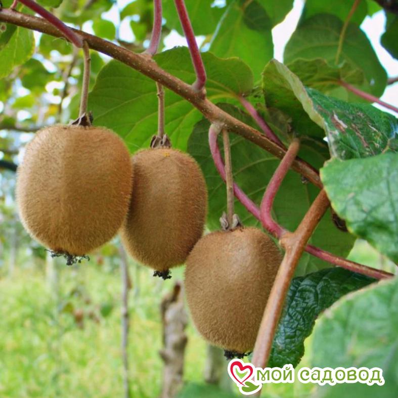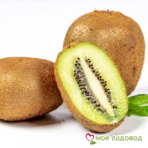 Актинидия деликатесная — невысокая, до 9 м., лиана либо вьющийся кустарник. Для роста и полноценного развития необходима опора. Плоды этого растения, киви, хорошо известны каждому современному человеку. Они значительно крупнее, чем у других видов, до 6–7 см. в диаметре, округлые или вытянутые, зеленые или коричневые. Мякоть зеленоватая, беловатая или бурая, со множеством темно-фиолетовых или черных семян.