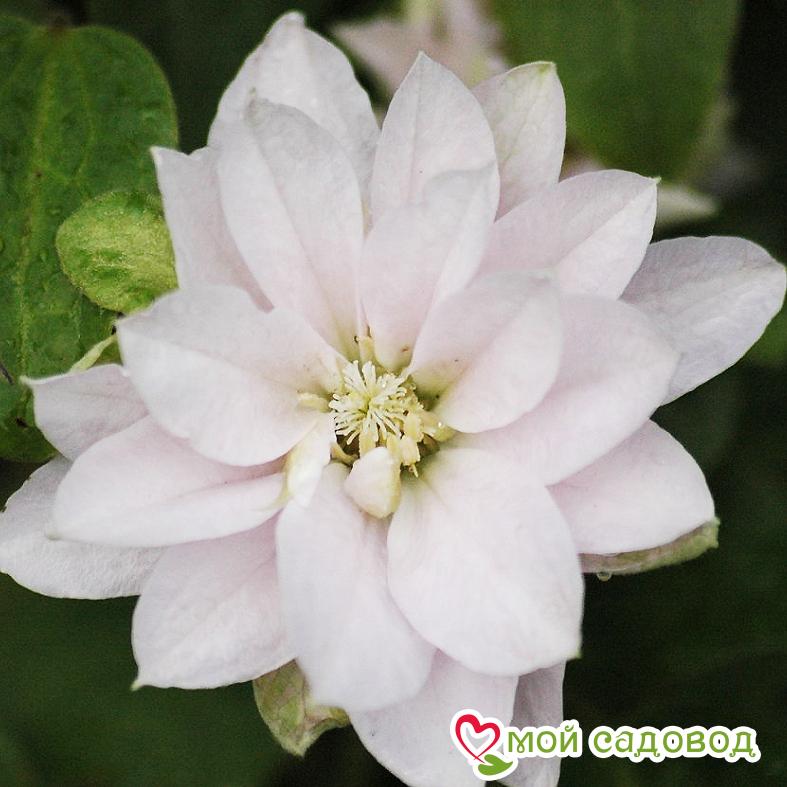 Высота взрослого экземпляра составляет 1,5 – 2 м. Лиана нуждается в опоре. Молодые листья пурпурного цвета. Цвести гибрид начинает в июне. Длится этот период до августа включительно. Цветки махровые, диаметром 6 – 8 см. Лепестки окрашены в бело-розовый цвет. Тычинки – бледно-желтые. Аромат тонкий и ненавязчивый.