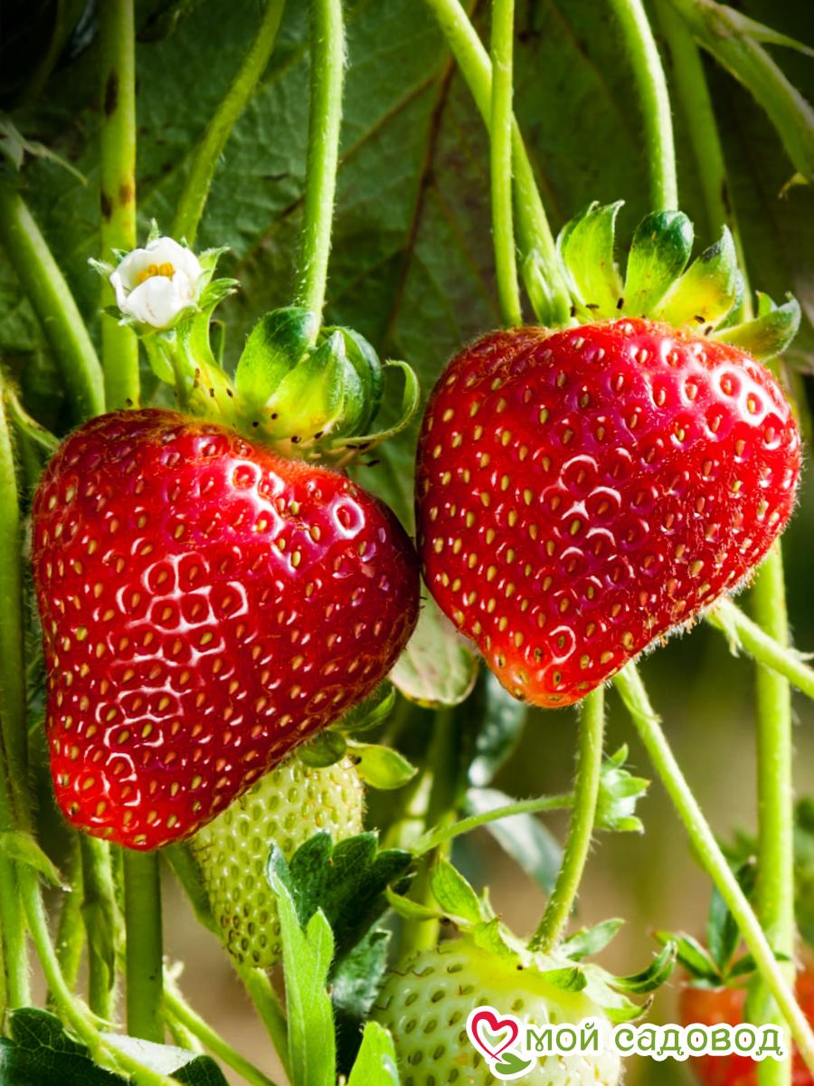 Клубника Сопрано ремонтантная — Кусты невысокие, мощные и раскидистые, густо покрыты темно-зеленой листвой. Цветоносы располагаются выше листьев, под тяжестью урожая пригибаются к земле. Цветет сорт крупными белыми цветами с желтой серединкой.