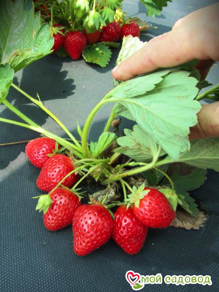 Клубника Сопрано ремонтантная — Кусты невысокие, мощные и раскидистые, густо покрыты темно-зеленой листвой. Цветоносы располагаются выше листьев, под тяжестью урожая пригибаются к земле. Цветет сорт крупными белыми цветами с желтой серединкой. Плоды сердцевидной формы, довольно крупные, к концу сезона не мельчают. Средний вес одной ягоды составляет 17-22 гр. Кожица у спелой клубники ярко-красного цвета с глянцевым блеском, покрыта желтыми вдавленными семянками. Мякоть – сочная, красно-бордовая с белой серединой. Вкус Сопрано – идеальный, сладкий без кислинки. Аромат клубники ярко-выраженный земляничный. Посадка: осенью (с середины августа до середины октября) и ранней весной Освещение: яркий солнечный свет Почва: легкая – суглинок, супесь, чернозем или лесные, богатые органикой грунты с водородным показателем pH 5,7-6,2 Полив: утренний, с конца апреля – один раз в 10-12 дней, расходуя на каждый м² участка 10-12 л воды Подкормки: минимум три раза в год: ранней весной, в период бутонизации и в августе Обрезка: когда листья начнут желтеть, покрываться пятнами и сохнуть, их обрезают Размножение: усами (розетками), делением куста