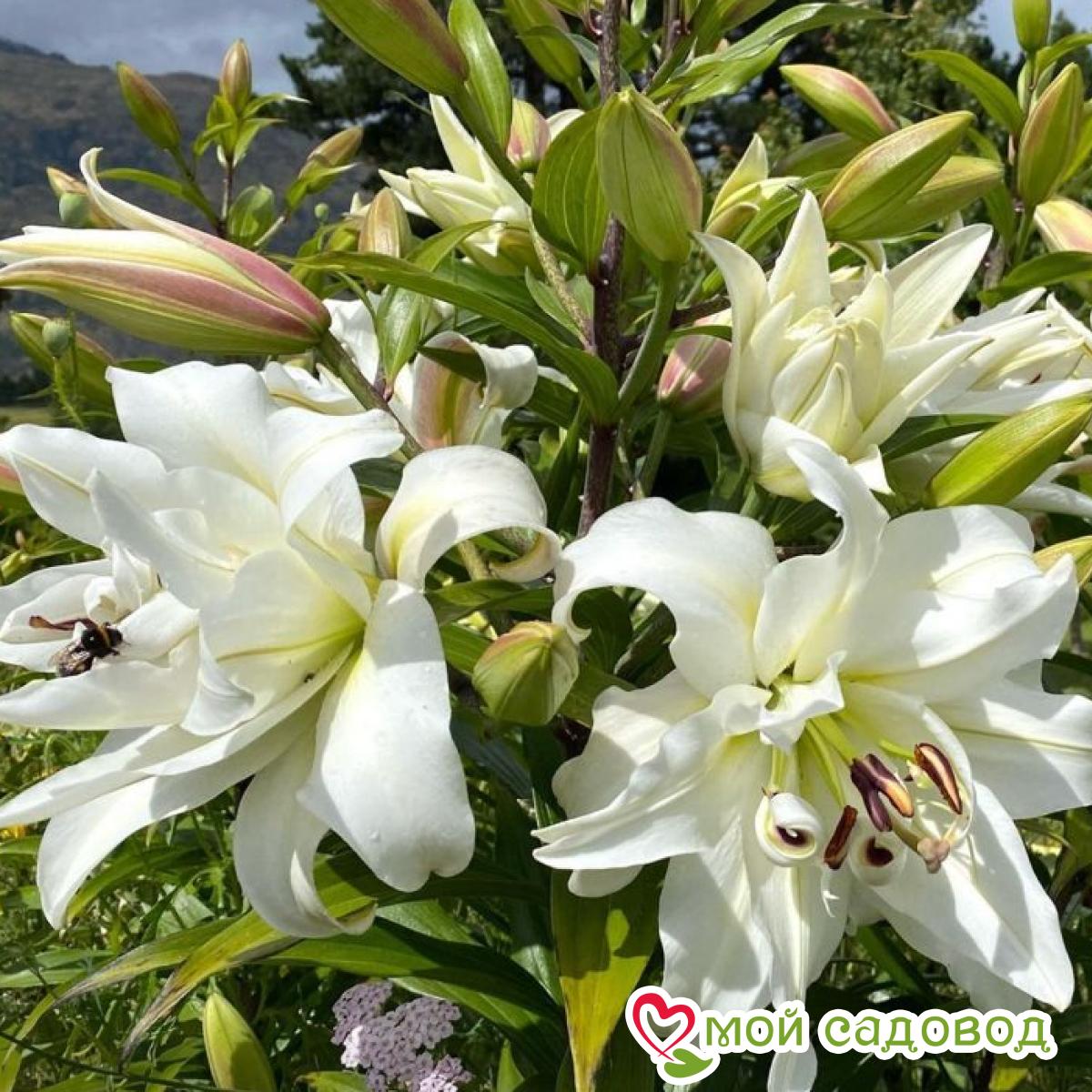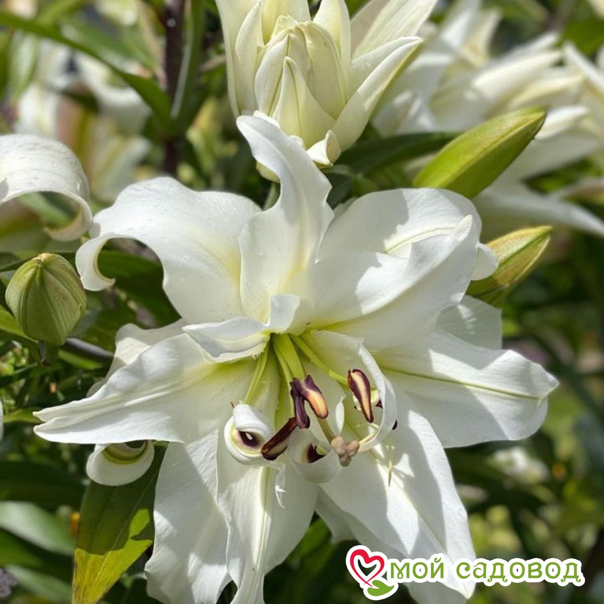 Образует крупные, до 30 см в диаметре, белые махровые душистые цветки с завернутыми вниз лепестками. Высота растения от 130 до 150 см. Цветет лилия в июле-августе. Уход за лилиями включает в себя прополки, поливы, рыхления, подкормки, борьбу с болезнями и вредителями. Поливают лилии в период цветения, поддерживая почву в увлажненном состоянии. Чтобы избежать пересыхания и перегрева почву мульчируют перегноем или торфом слоем в 5-6 см. Лилии хорошо отзываются на подкормки. Первую подкормку проводят весной после схода снега, разбрасывая по поверхности почвы азотные удобрения. Во время бутонизации растения поливают растворенной в воде аммиачной селитрой, непосредственно перед цветением использую фосфорно-калийные удобрения в жидком виде, в конце лета, но не позднее середины августа, лилии подкармливают фосфором и калием. Выращивать лилии на одном месте дольше 3-4 лет крайне нежелательно: луковица нарастает, становится рыхлой, растениям становится тесно по соседству. На 5 -6 год заметно снижается высота цветоноса, количество бутонов и значит, луковица истощена, а это может привести к заболеваниям и гибели растения. Осенью, когда надземная часть растения отмерла, стебель обрезают на высоте 15 см от поверхности почвы, гнездо выкапывают целиком, отделяют от материнской луковицы детки и высаживают их на доращивание. Саму материнскую луковицу пересаживают на новое место. В нашем интернет-магазине вы сможете купить Лилии Так же возможно вас заинтересуют Лилия-дерево Пурпл Принц и Лилия (ЛО-гибрид) Пинк Хевен