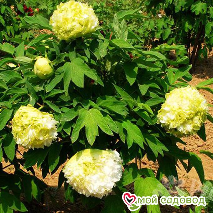 Цветок густомахровый, шаровидно-корончатый, 12 х 6 см, светло-салатового цвета с тёмно-фиолетовыми вкраплениями в основании лепестков. Внутренние лепестки плотно прилегают друг к другу, полностью скрывая сердцевину. Цветки смотрят в стороны или вниз. Стебли тонкие, гибкие. Цветение обильное, в поздние сроки. Высота 120-150 см. Один из самых редких сортов. Место посадки Для посадки пионов понадобится защищенное от ветров место с хорошей освещенностью. Сорта светлой окраски, а также пионы с простыми и полумахровыми цветками можно посадить на частично затеняемом участке, это продлит цветение и защитит цветы от выгорания. ХРАНЕНИЕ ДО ПОСАДКИ: После получения посылки, рекомендуем вскрыть пакет и осмотреть корневище. Почки должны быть плотные и розового цвета. Так же уделите внимание самому корневищу, все сомнительные, потемневшие, сморщенные части удалите, а места среза обработайте зеленкой или залой. Если почки еще не тронулись в рост, а высаживать в открытый почву рано, советуем Вам хранить корневище в холодильнике, обязательно оставляя его в пакете с торфяной смесью или в коробке под снегом. Если почки успели раскрыться это не критично, сохранить до посадки их так же возможно, высадите корень пиона в большой просторный горшок или в любую другую ёмкость.