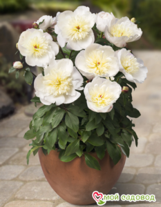 В течение сезона цветы поливают, подкармливают органическими и комплексными удобрениями. Отцветшие бутоны своевременно срезают. На зиму побеги обрезают на высоте в 3-5 см. Обильно мульчируют смесью торфа и опилок. Молодые пионы рекомендуется укрыть хвойным лапником или агроволокном.